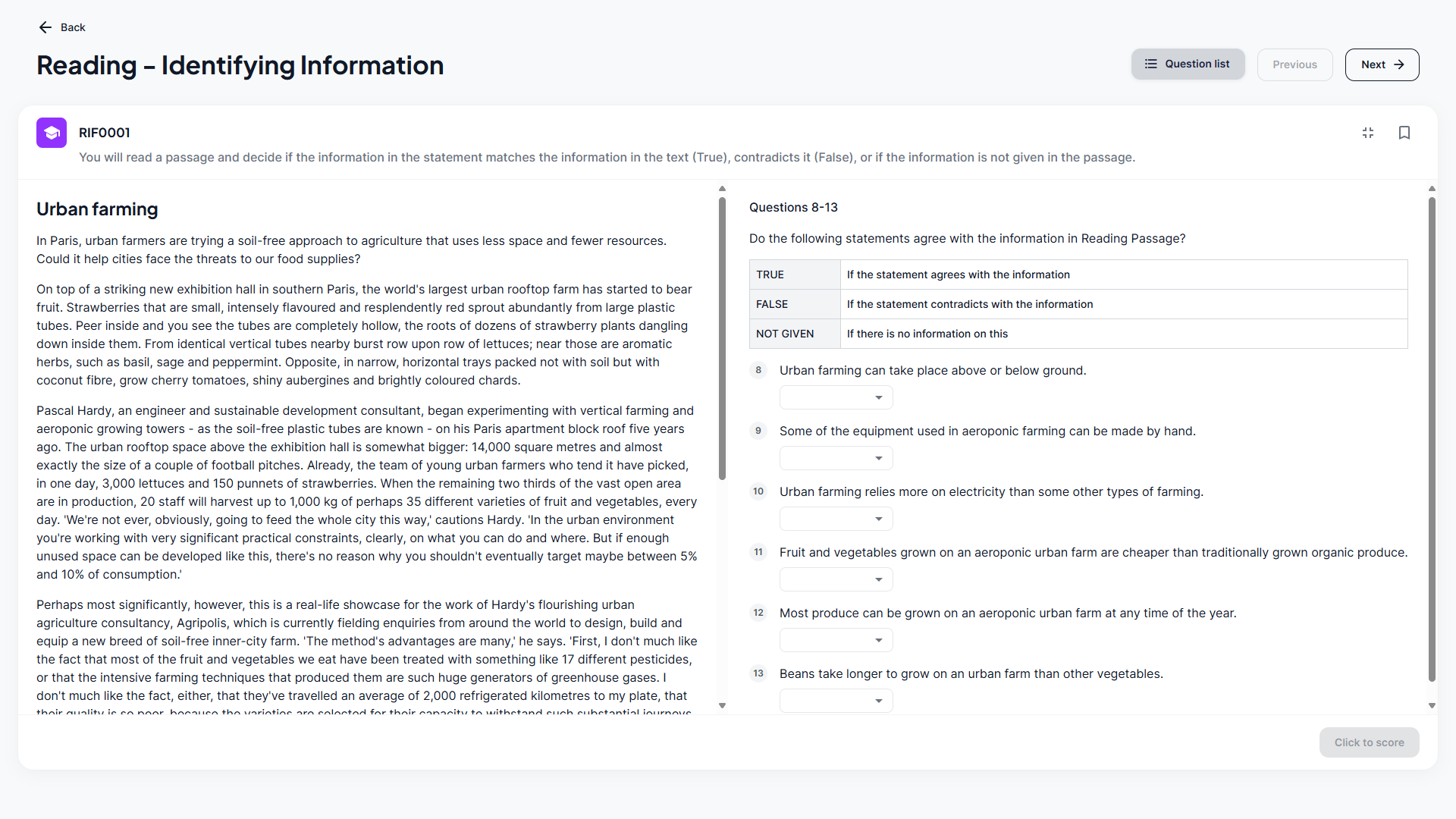 Read the passage and select the appropriate corresponding answers. Once finished, click on Click to score to review.