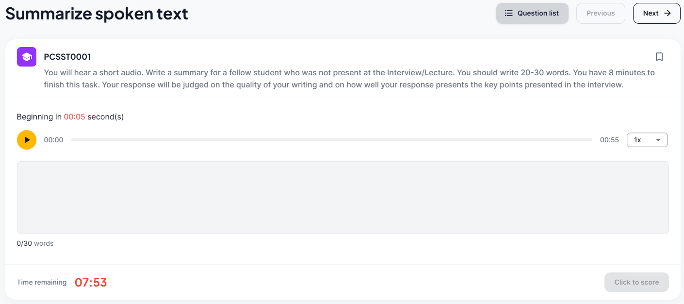 Click the Start to practice button to start practicing Summarize Spoken Text.